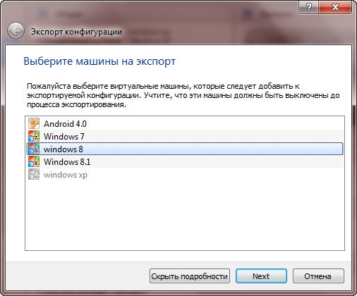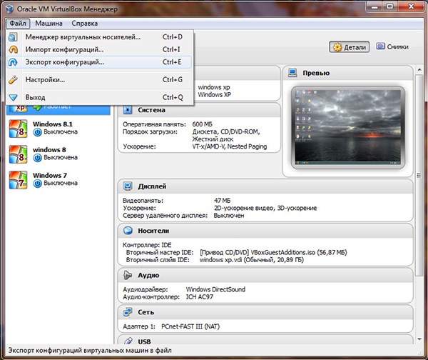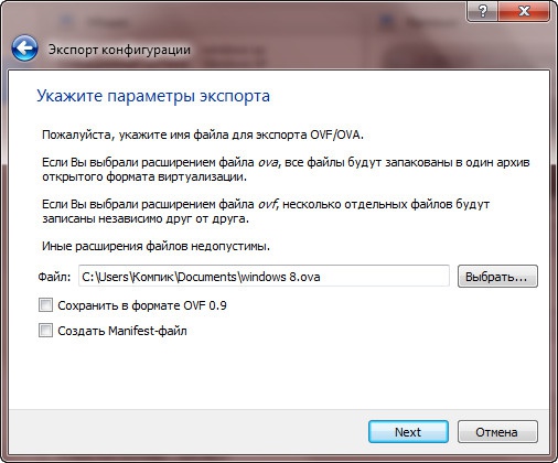 Данная функция позволяет переносить созданную в VirtualBox машину на другие компьютеры, вернее на другие системы виртуализации, например на VMware или Microsoft Virtual PC. Для этих целей был разработан специальный кроссплатформенный стандарт Open Virtualization Format или OVF. Этот формат считается универсальным, однако исключать, что при переносе виртуальной машины на другой продукт виртуализации пользователь не столкнется с определенного рода проблемами нельзя. При экспорте с VirtualBox гостевая операционная система конвертируется в единый файл формата OVF, который потом может быть развернут на других системах виртуализации.