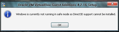 Oracle VM VirtualBox имеет базовую поддержку технологий 3D. Благодаря 3D вы сможете запускать на виртуальной машине не слишком требовательные к ресурсам игры, а также наслаждаться эффектами Aero. По умолчанию поддержка 3D отключена. Чтобы установить ее, вам нужно закрыть виртуальную машину, перейти в настройки и в разделе “Дисплей” установить соответствующие галочки. Затем, загрузив виртуальную операционную систему в безопасном(!) режиме, установить или переустановить Дополнения гостевой ОС, не забыв при этом в окне установщика отметить галочкой пункт “Direct3D Support…”. Установить драйвер поддержки 3D в обычном режиме не получиться, а если попытаетесь это сделать, то получите вот такое предупреждение.